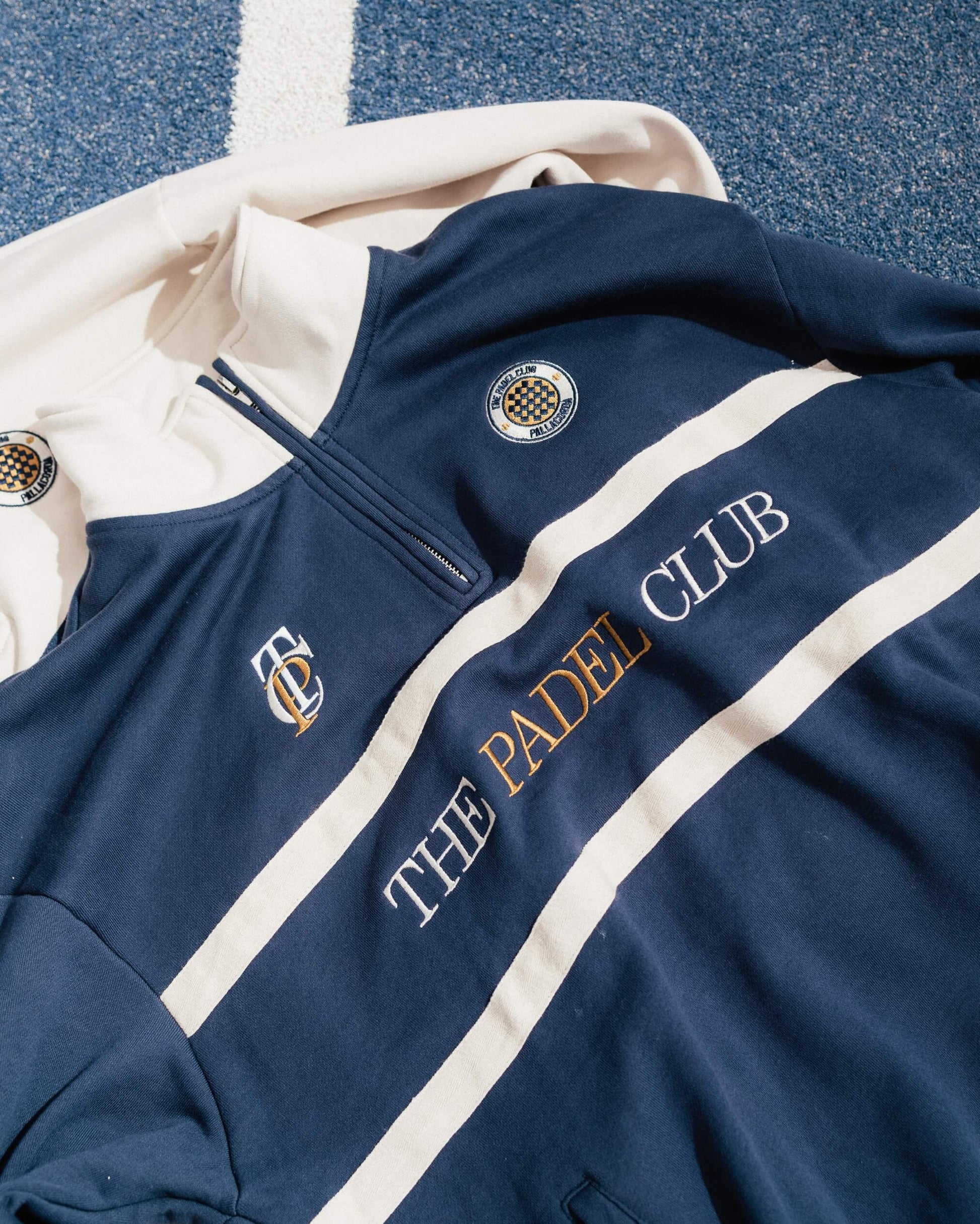 Varsity Design: Cream chest stripes and contrast The Padel Club print for a classic collegiate look.